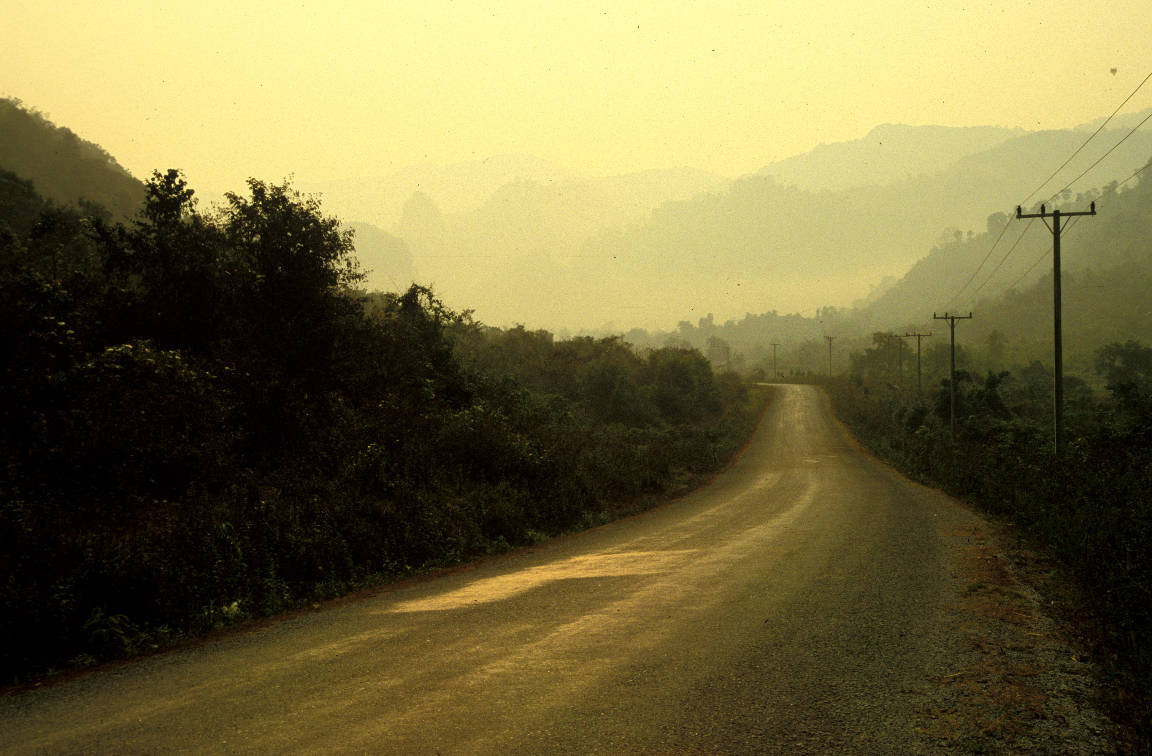 After a poor sleep, the result of being serenaded by loud karaoke and a room light that, for the love of me, I couldn’t figure how to turn off, I left the restaurant cum guest house and made my way past the town of Phou Khoun, the turnoff for Phonsavan and the Plain of Jars. An amazing downhill run of almost 15 kilometers greeted me, the reward for the previous day and a half of climbing. Traffic was predictably light, almost non-existent, until I reached the bottom of the grade. Here, the haze grew thicker and lower, with the decidedly strong smell of smoke – fire!